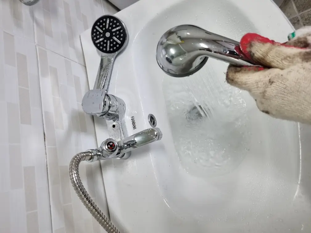 온수와 냉수를 번갈아 틀어보면서 온도 조절이 원활한지 확인합니다. 또한 샤워 전환 레버를 당겨 물이 샤워 헤드로만 나오는지, 수전 토출구로는 물이 나오지 않는지 점검합니다. 레버를 내렸을 때는 다시 수전으로만 물이 나와야 합니다.